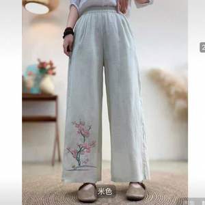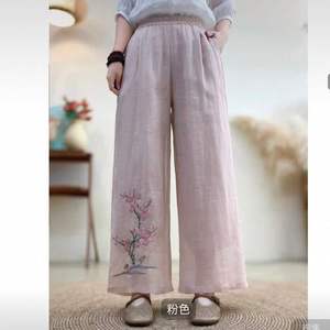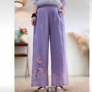 100kg 大きいサイズ中国風の綿とリネンのパンツ夏のエスニックスタイル刺繍カジュアルパンツレトロワイドレッグルーズパンツ女性のための
