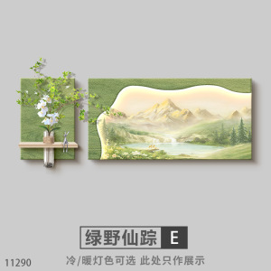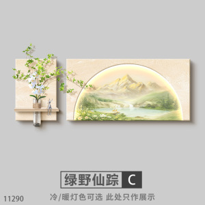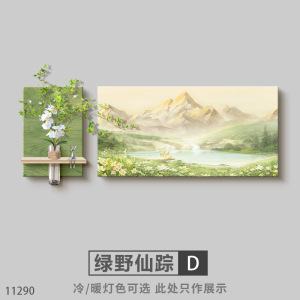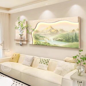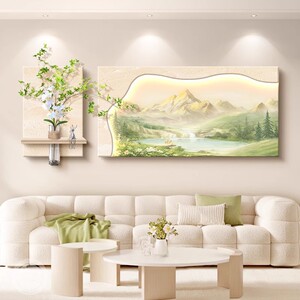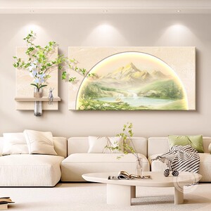 奶油风客厅装饰画原木大气日照金山沙发背景墙挂画感山水壁灯