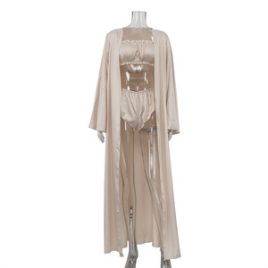 跨境女装长袖开衫长袍抹胸短裤休闲三件套2025新款慵懒风睡衣套装