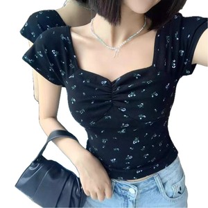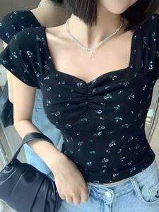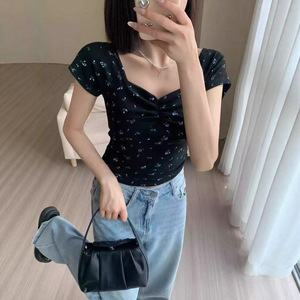 港风复古碎花方领短袖T恤女夏季新款设计感小众修身显瘦别致上衣