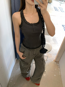 韩系灰色木耳边小吊带背心女2025年新款独特设计感显瘦无袖上衣女