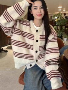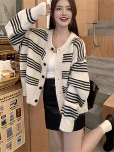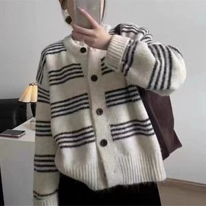 黒と白のストライプのセータージャケット女性のための 2025 秋と冬の新しいスタイルのニットカーディガン韓国スタイルのルーズショートトップ