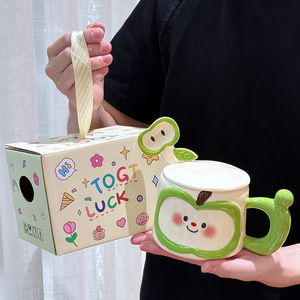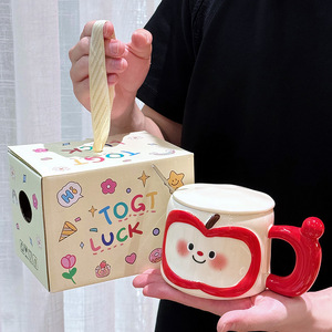 かわいいリンゴのセラミックマグ 蓋とスプーン付き 男性と女性の見栄えの良いカップル オフィス ホーム ドリンク 誕生日プレゼント