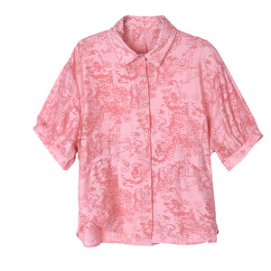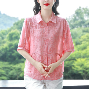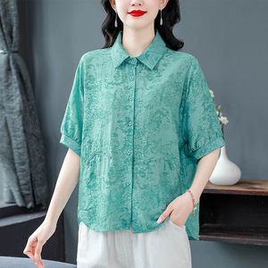 女性用テンセル薄手半袖シャツ、夏の新しいスタイル、ファッショナブルな気質のシャツ、ゆったりお腹カバー、ママの綿麻トップス
