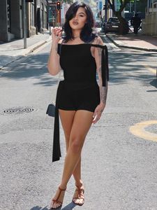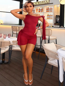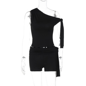 ヨーロッパとアメリカの服 2025 夏の新無地ファッション斜め襟ノースリーブトップレースアップスリムショーツツーピーススーツ