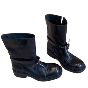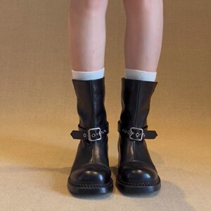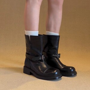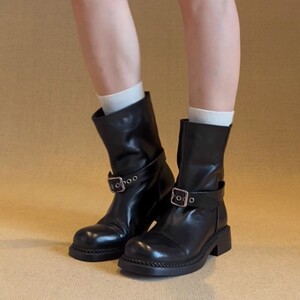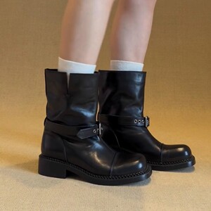 马丁靴女粗跟厚底中筒靴子2025秋新款复古皮带扣大码41-43机车靴