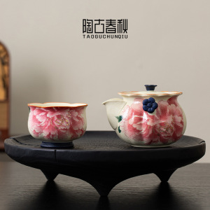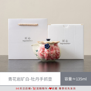牡丹花青花岩矿白手抓茶壶一壶两杯功夫茶具套装复古泡茶壶礼盒装