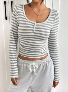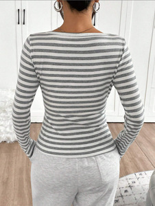 跨境休闲条纹美式辣妹v领连帽基础修身上衣