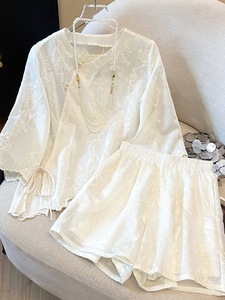国风唐装斜襟盘扣上衣配短裤两件套女夏季薄款新中式绣花时尚套装