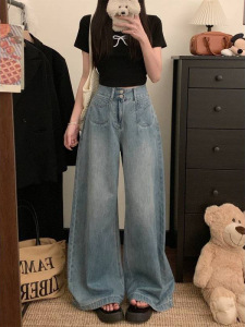 高腰双扣宽松阔腿牛仔裤女春季设计感大码垂感直筒显瘦拖地长裤子