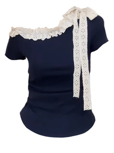 韩系木耳边绑带斜肩短袖T恤女夏季设计感修身显瘦露肩甜辣妹上衣