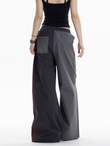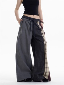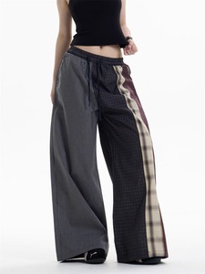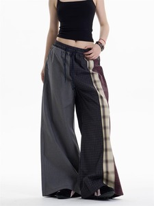 レトロな不規則なチェック柄のコントラストカラーステッチカジュアルパンツ夏の新しいスタイルのウエストゴムワイドレッグルーズで多用途なロングパンツ