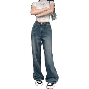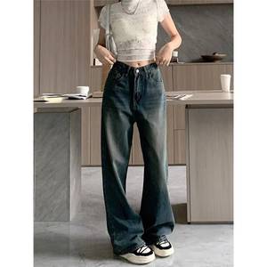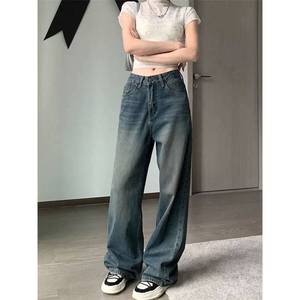 女性のためのレトロブルーハイウエストワイドレッグジーンズ2025秋ニッチドレープルーズカバー肉痩身ストレートレッグフロアレングスパンツ