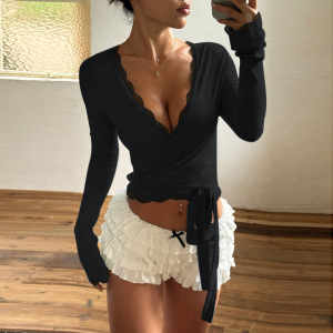 JY25324 ヨーロッパとアメリカンスタイルのレースVネックストラップ長袖クロスボーダー2025秋冬新作へそ出し無地トップス