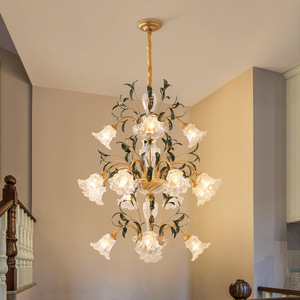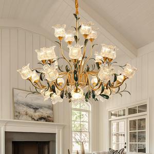 フレンチレストランのシャンデリア、クリーム色のクリスタル、複層住宅、ヴィラ、中二階、広いリビングルーム、中空、アメリカンスタイル、軽奢風