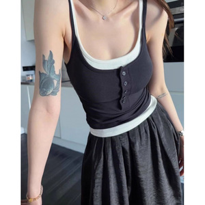 10125#夏季新款假两件吊带背心圆领显锁骨一体式带胸修身甜辣风