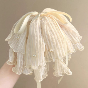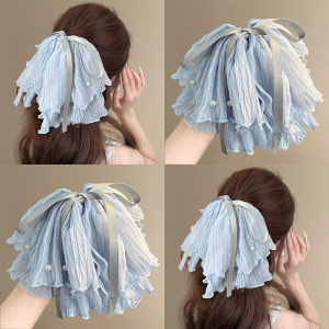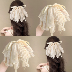 韩版气质双层蝴蝶结鲨鱼夹发饰珍珠褶皱网纱半扎发马尾夹大号