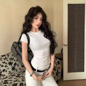 灰色短袖t恤女夏季修身显瘦叠穿内搭打底衫纯色外贸掐腰上衣