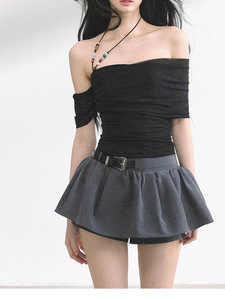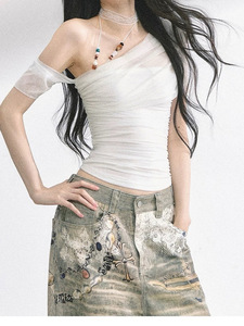 薄暮之海 微透斜肩薄款短袖T恤女夏收腰显瘦辣妹设计感上衣