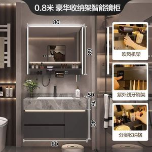 [アイアングレー] - 高級多機能収納ラック スマートミラーキャビネット - 80CM - [スレートセラミックシームレス洗面器]