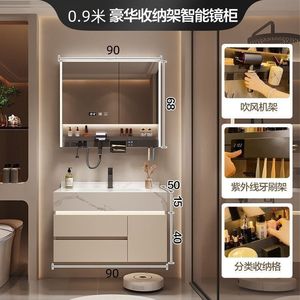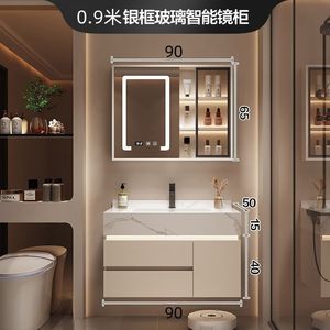 【クリーム色】-高級多機能収納ラック スマートミラーキャビネット-90CM-【スレートセラミックシームレス洗面器】
