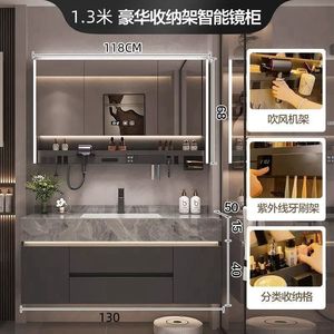 [アイアングレー]-高級多機能収納ラックスマートミラーキャビネット-130CM-[スレートセラミックシームレス洗面器]