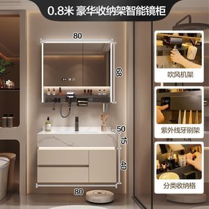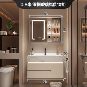 [クリーム色]-高級多機能収納ラックスマートミラーキャビネット-80CM-[スレートセラミックシームレス洗面器]