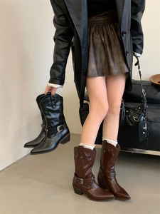 复古皮带扣中筒骑士靴女2025秋冬新款方头粗跟显瘦西部牛仔靴