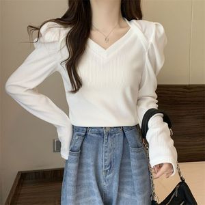 秋冬の女性用Vネックコーデュロイシャツ、新しい韓国風デザイン、ニッチなパフスリーブトップス、年齢を減らし、美しくスタイリッシュです。
