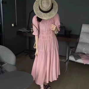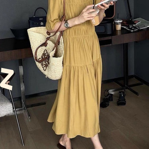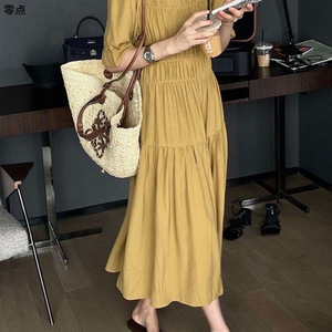 欧货泡泡袖棉绸连衣裙女2025新款收腰显瘦茶歇裙法式初恋桔梗长裙