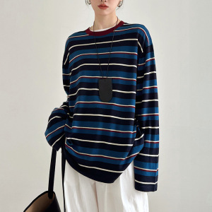 羊毛桑蚕丝天丝罩衫春夏复古撞色条纹长袖针织衫女