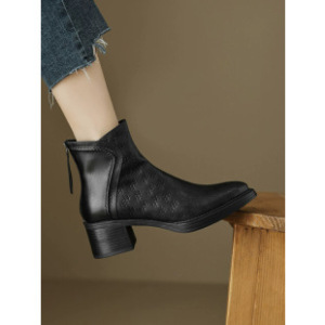洋气小短靴女春秋单靴圆头中跟高跟靴粗跟真皮后拉链羊皮加绒杏色