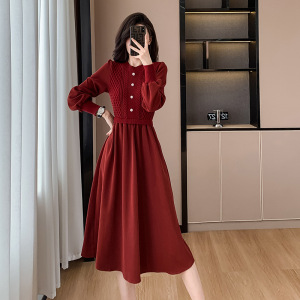 加厚红色连衣裙秋冬新款针织毛衣裙女圆领配大衣打底红裙子中长款