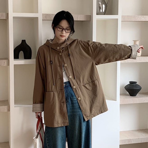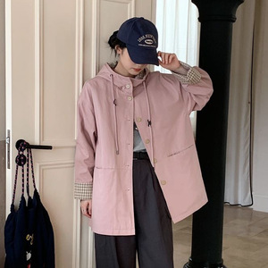 フード付き巾着ジャケット 2025 秋の新デザインファッショナブルなチェック柄ステッチ長袖ウインドブレーカー女性のための 83311
