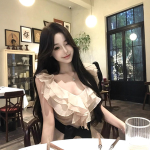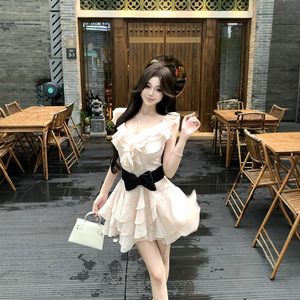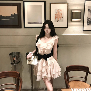 实拍现货新款裸粉千金天丝连衣裙夏季荷叶边温柔度假风公主蛋糕裙