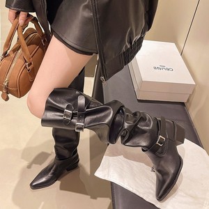 靴女尖头堆堆长靴2025粗跟两秋冬新款美拉德穿皮带扣骑士靴高筒靴