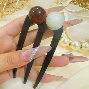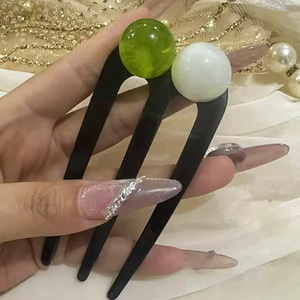 优雅三齿U型发簪通勤丸子头盘发器后脑勺固定发钗珠珠装饰