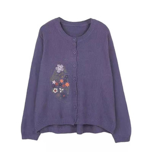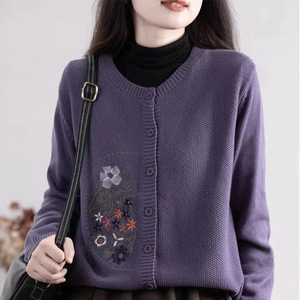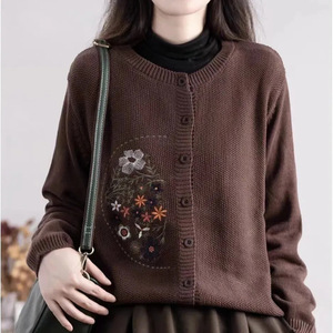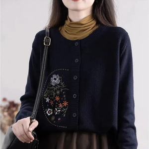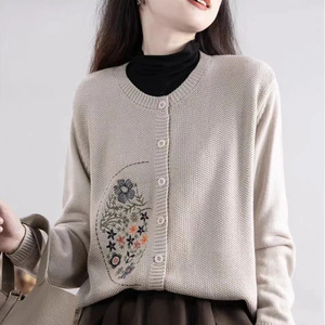 早秋宽宽松圆领绣花单排扣复古简约百搭针织开衫毛衣上衣开上外穿