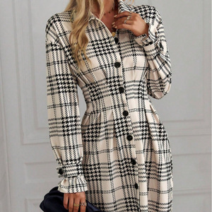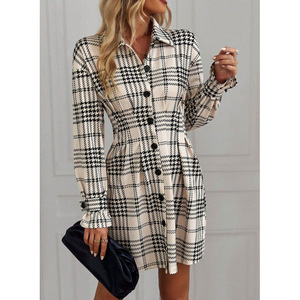 外贸亚马逊独立站跨境欧美女装春秋季新款格子印花连衣裙衬衫裙