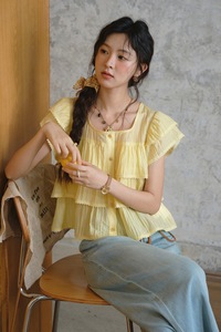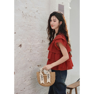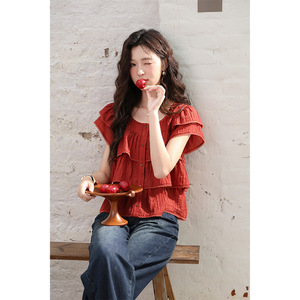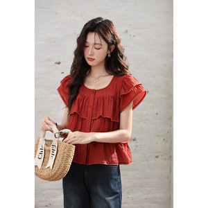 谜家天丝混纺法式衬衫女2025夏季新款小个子显白红色蛋糕小衫上衣