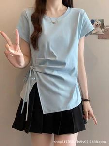 ミルクイエローの右肩半袖Tシャツ女性用2025夏大きいサイズファットmmウエスト不規則な巨大痩身パーソナライズトップ