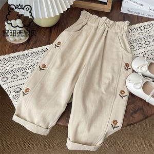 纯棉女童春秋宝宝日韩洋气新款可爱风儿童花朵刺绣花苞哈伦裤洋气