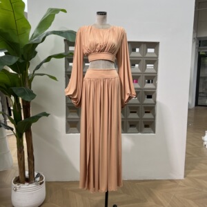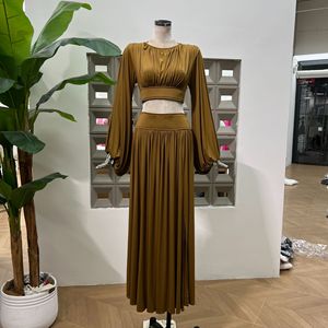 Amazon レディース 2025年夏 ソフトワックスランタン 長袖へそ出しショートトップ+ロングスリットスカート 2点セット