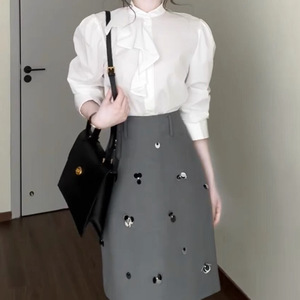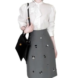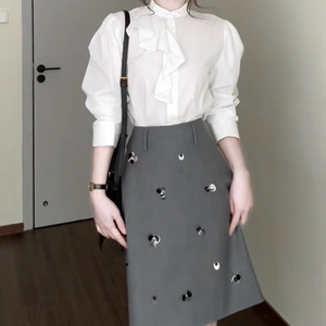 Qianyuの新しい夏の白いフリルシャツとグレーのスカートはとても見栄えが良く、ユニークで美しいツーピーススーツです