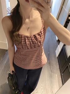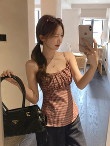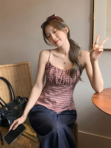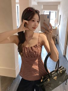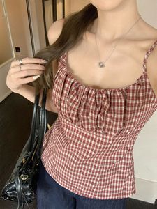 韓国のユニークなデザインの赤いチェック柄キャミソール女性のための夏 2025 新しいバックレスハイエンド美しいバックトップ
