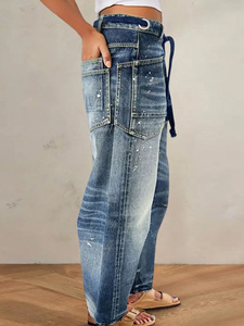 现货女装水洗怀旧阔腿牛仔裤 抽绳腰带装饰 时尚怀旧风 2025新款