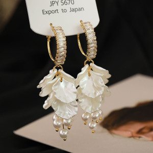 度假风白色花瓣珍珠流苏耳环高档锆石时尚气质小香风温柔显瘦耳坠