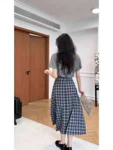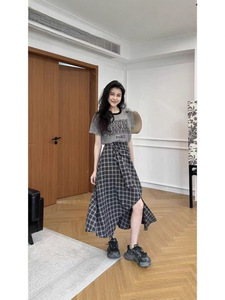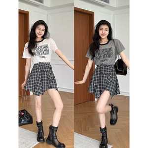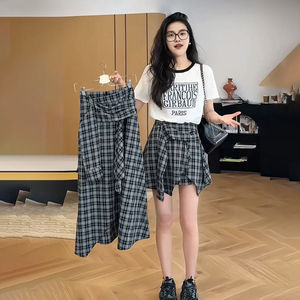 2025夏季新款韩系穿搭慵懒风印花短袖上衣搭配格子半身裙裤两件套