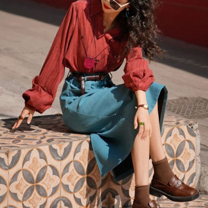 2025春季新品女港风复古V领长袖斜襟红衬衣宽松休闲气质百搭上衣