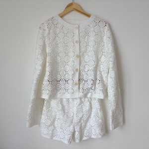 90-130斤2026早春集优雅法式钩花镂空圆领轻奢长袖+短裤针织2件套